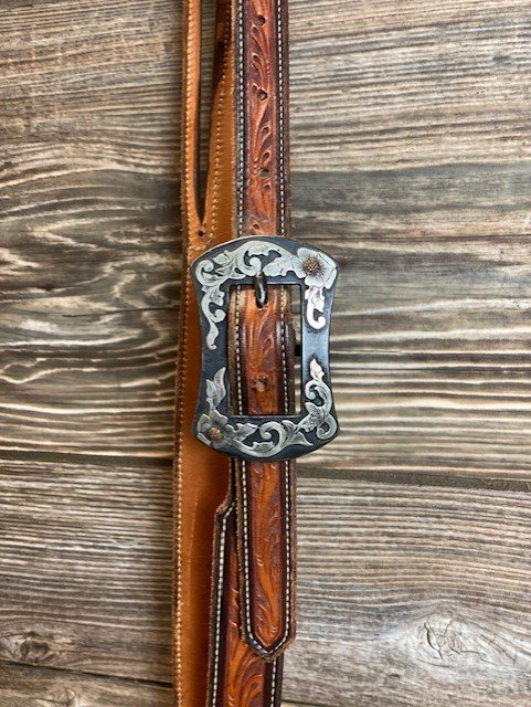 Bullinger Hand-tooled split ear headstall. Dyed border and antique finish. Sabrina Theil Hardware.